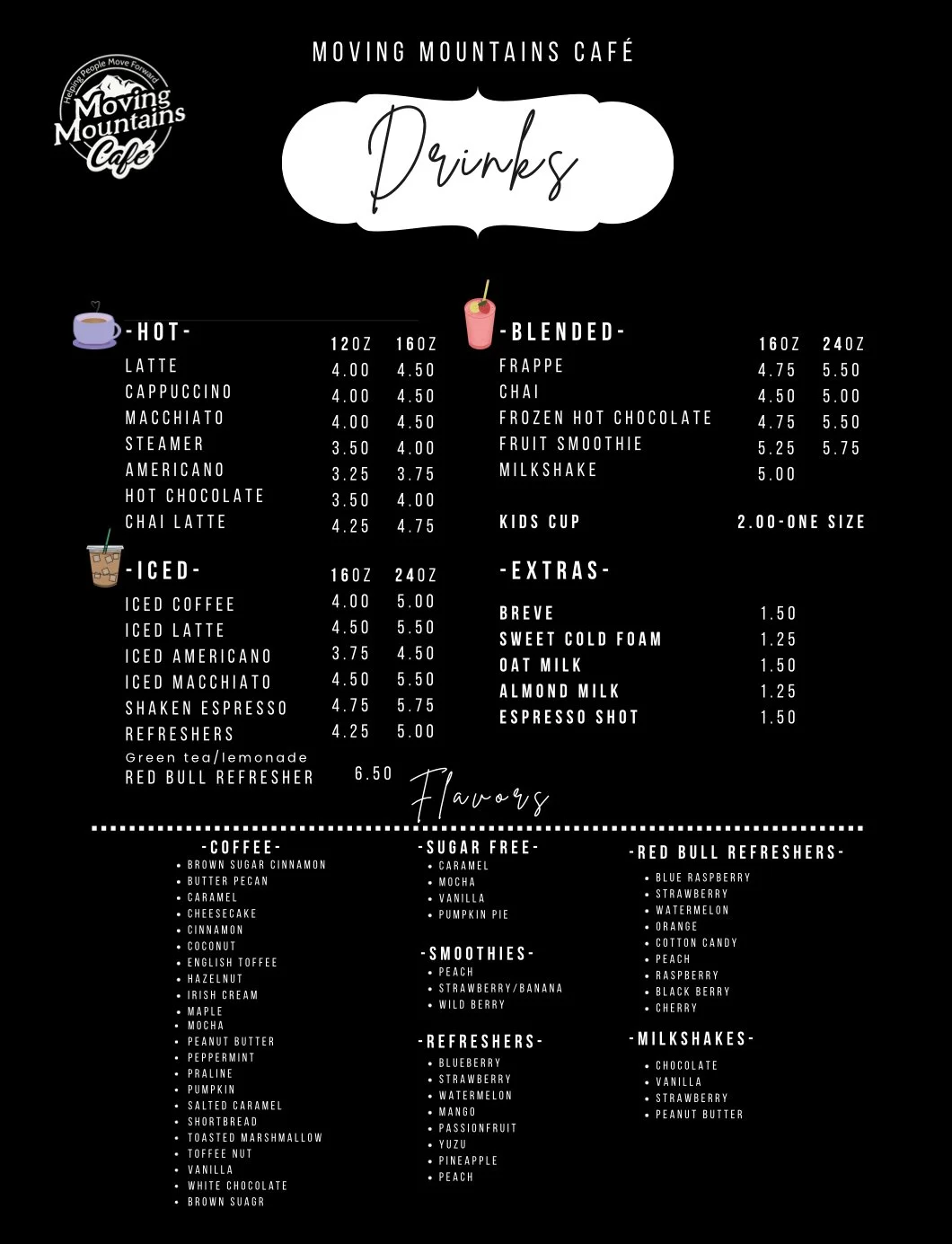 Leading our team is our manager, Alivia Nortz, whose heart for hospitality and love for her community help shape the café’s warm, inviting atmosphere. Whether you’re here for your morning coffee or to host a special event, Alivia and the Moving Mountains team are here to make every visit feel like home.